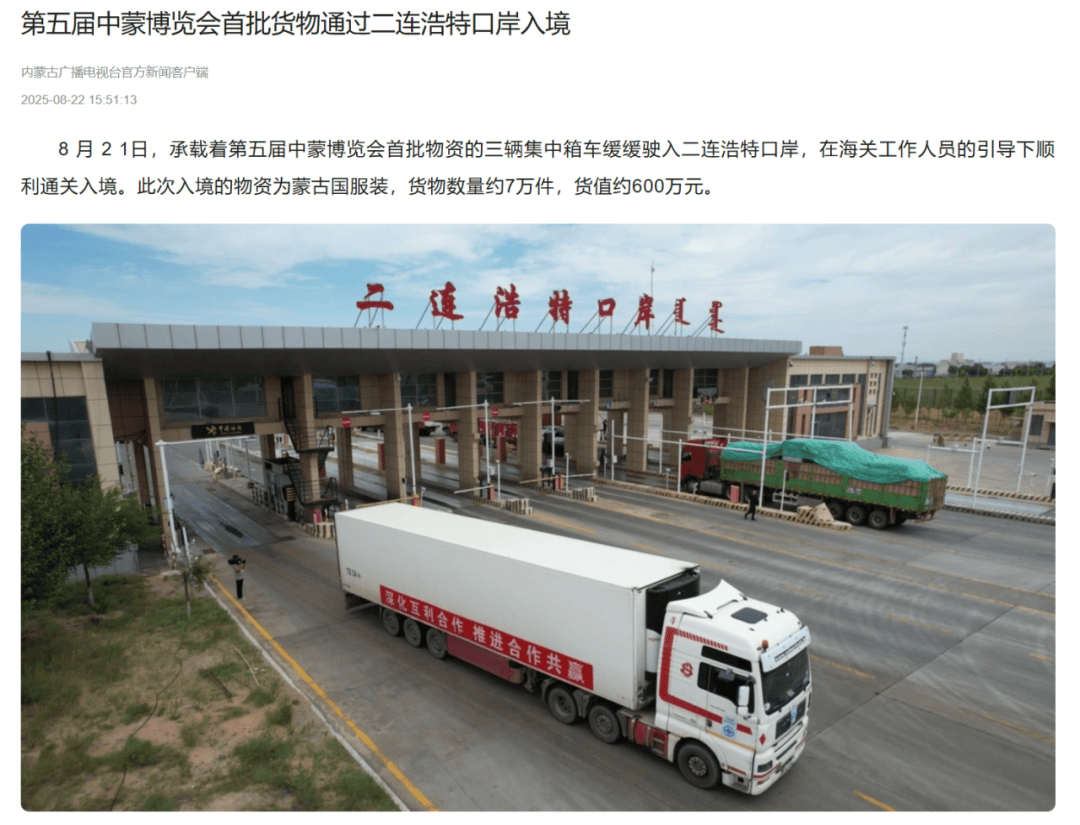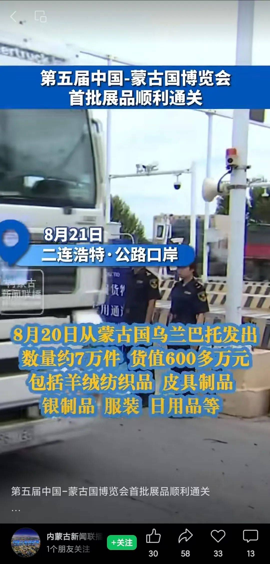 ●8月22日,《内蒙古新闻联播》微信公众平台发布文章《第五届中国一蒙古国博览会中蒙博览会迎来首批入境参展商》。(口岸监管处、二连海关供稿)