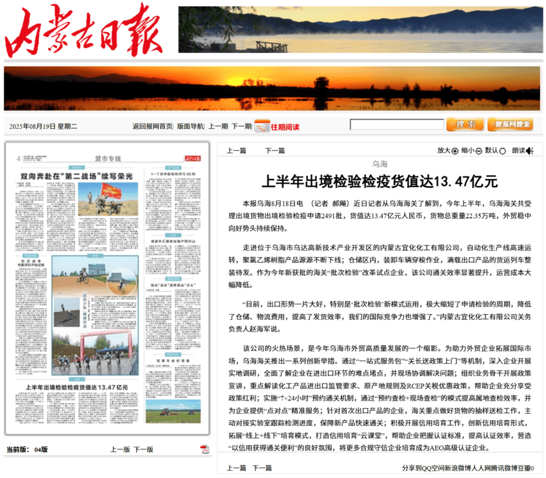 ●8月19日,《内蒙古日报》发布文章《上半年出境检验检疫货值达13.47亿元》。(乌海海关供稿)