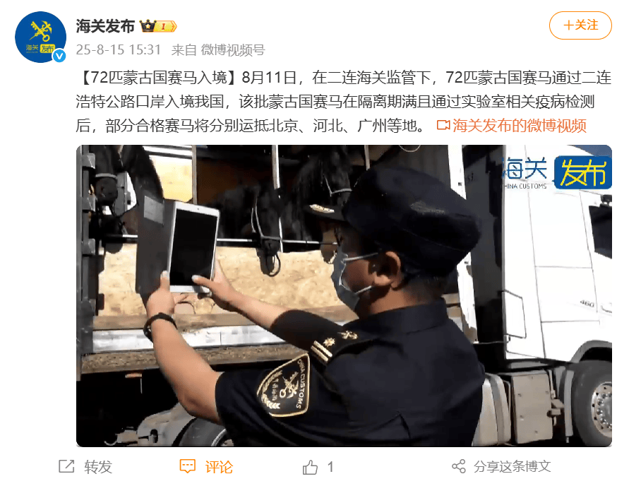 ●8月15日,《海关发布》微博发布视频《72匹蒙古国赛马入境》。(二连海关供稿)