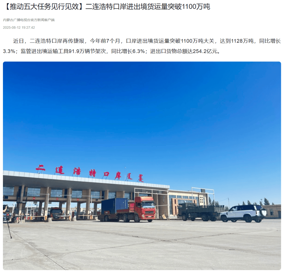 ●8月12日,《奔腾融媒》发布文章《二连浩特口岸进出境货运量突破1100万吨》。(二连海关供稿)