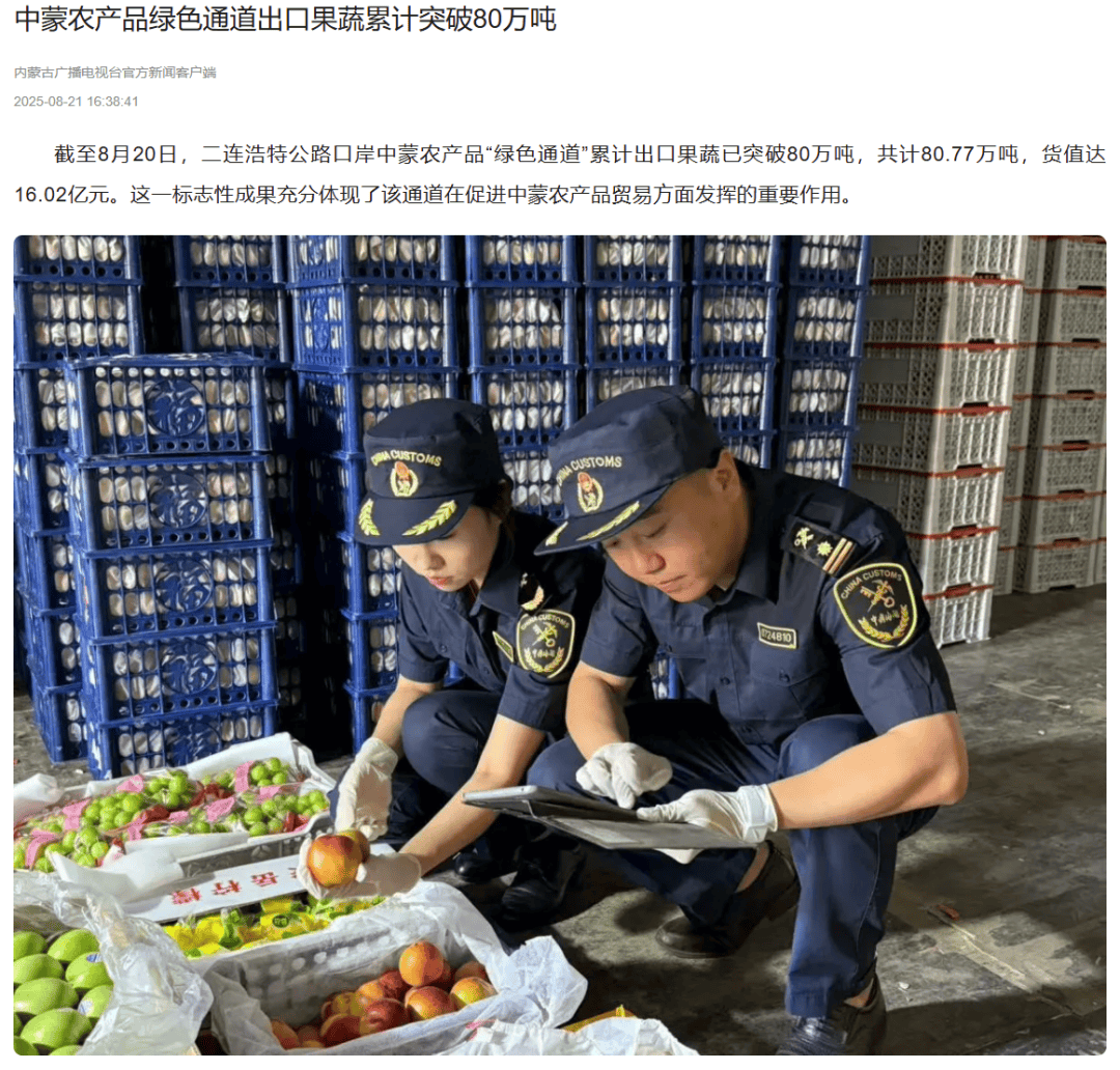 ●8月13日,《人民日报》客户端发布文章《内蒙古二连浩特口岸今年出口果蔬货值破2亿元》。(二连海关供稿)
